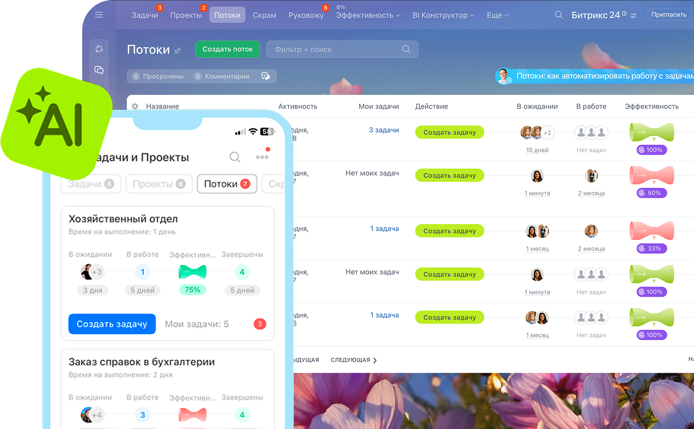 Cовершенно новый способ организации работы сзадачами. Битрикс24 Потоки визуализирует процессы — вы сразу будете видеть, всё ли в порядке или нет. Исможете решать проблемы до того, как всё сломалось.